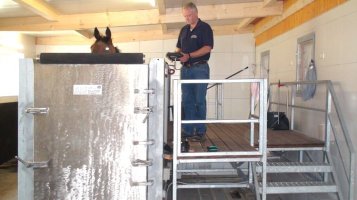 Während der gesamten Trainingszeit im Wasser steht ihr Pferd unter ständiger Beobachtung und direktem Kontakt zum Therapeuten. Beim Wassertreten im Aquatrainer kann der Pferdeosteopath sehr gut etwaige Fehlstellungen des Beckens und der Wirbel erkennen. Zudem lässt sich hervorragend beobachten, wie die Pferde ihre Rücken- und Kruppenmuskulatur bei der Arbeit im Wasser beanspruchen und dabei gleichmäßig abfußen.